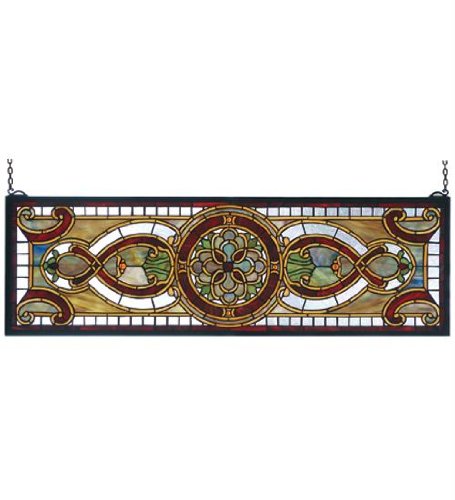 513 pieces of hand cut stained glass and 10 jewels are used to make this elegant transom window, featuring a floral medallion flanked with translucent figure eights and bordered in matching glass. Topaz, moss and burgundy are the prime colors of this tiffany style window. A solid brass hanging chain and brackets are included.
